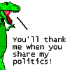 Description: Picture of T-Rex from Dinosaur Comics reading You'll thank me when you share my politics!